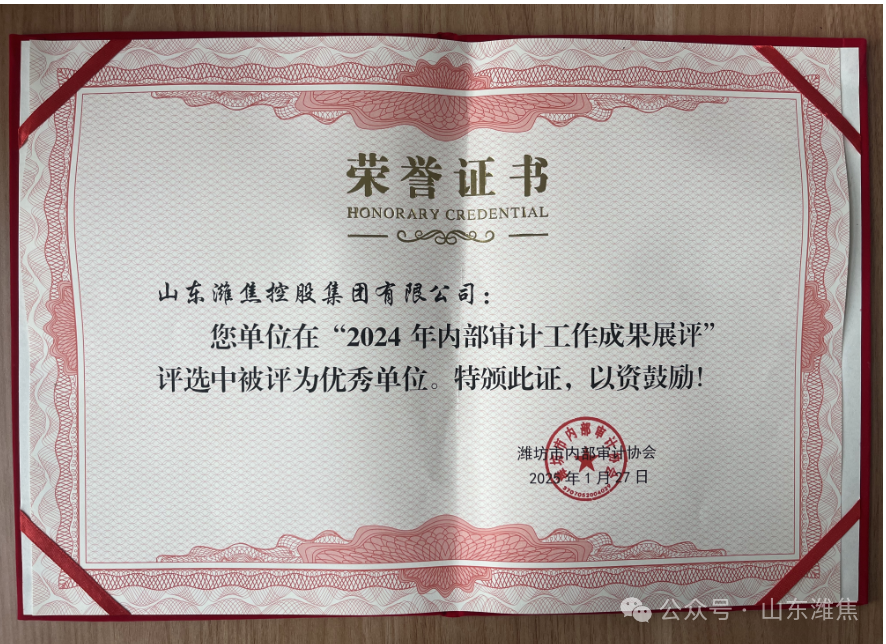 近日,濰坊市內(nèi)部審計協(xié)會組織2024年全市內(nèi)部審計工作成果展評,集團(tuán)公司榮獲“2024年內(nèi)部審計工作成果展評優(yōu) 秀單位”稱號。